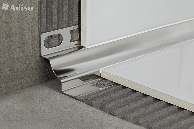 - À cet effet, vous pouvez acheter ici un tel profil en plastique ou en acier inoxydable, que vous voyez sur la photo. Il fixe non seulement la tuile, mais décore également les joints d'angle. Par conséquent, contrairement à la barre de départ, vous n'aurez pas à la démonter.