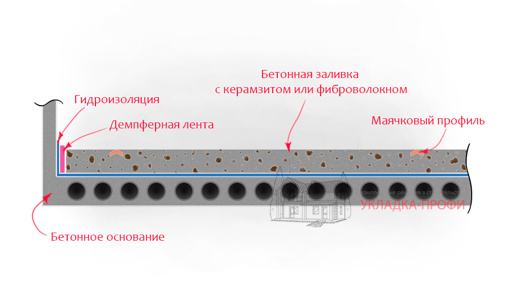 - La première. Une base en béton peut être faite en utilisant de l'argile expansée à gros grains ou de la fibre polymère comme charge. Dans ce cas, en plus de sceller les joints, le sol doit être imperméabilisé sur toute la zone - par exemple, du polyéthylène peut être posé. Ensuite, les balises sont installées, le remplissage est rempli et tout cela est versé avec du mortier de ciment de consistance liquide.