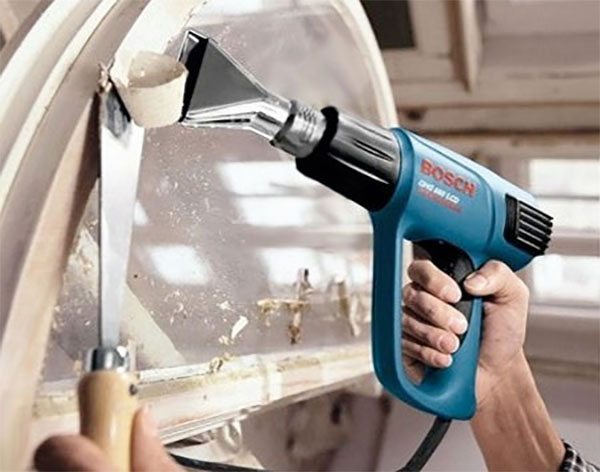 - Traitement thermique. L'essence de la méthode est l'impact sur une base de bâtiment avec un flux d'air chaud provenant d'un sèche-cheveux industriel ou d'un chalumeau. Après une telle manipulation, le revêtement gonfle et s'enlève facilement avec une spatule. L'inconvénient est que vous devez retirer le verre du cadre, car il éclaterait en raison de la température élevée.
