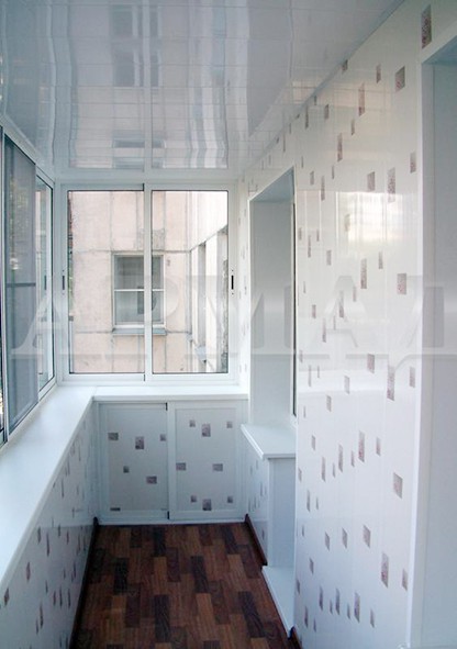- À la suite de la finition du balcon ou de la loggia avec des panneaux en PVC, vous pouvez obtenir une conception très soignée de ces pièces. La photo montre un exemple de finition de cette façon.