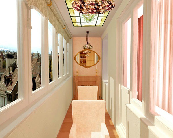 Le plafond sur la loggia peut être fait n'importe quel, même étirer. Comme vous pouvez le voir sur l'image ci-dessus, le plafond suspendu en plaques de plâtre avec un vitrail s'intègre également parfaitement à son intérieur.