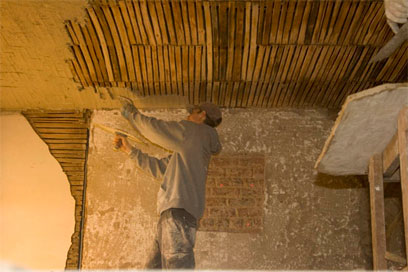 Travaux préparatoires pour l'application de plâtre dans un bain en bois