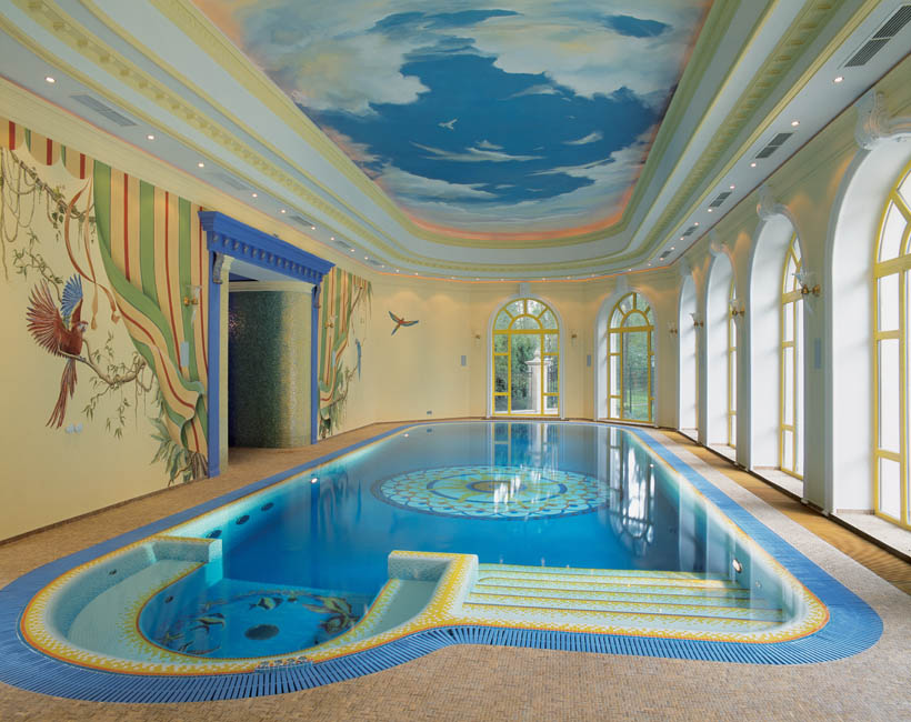 Si nous parlons de la pièce dans laquelle se trouve la piscine, il y a simplement une marge de manœuvre illimitée. La décoration principale de son intérieur peut être un plafond chic et des éléments d'aménagement paysager - oui, n'importe quoi.