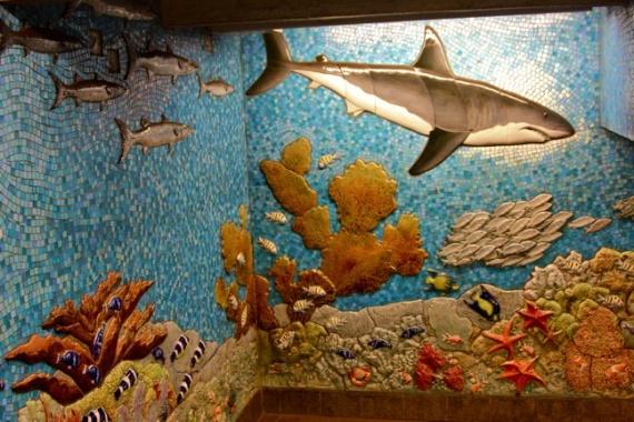 Du panneau sur les parois de la piscine, il a l'air très spectaculaire! Décorer la mosaïque en général fait des merveilles; elle est plus flexible en termes de réalisation de la pensée artistique créative que, par exemple, la tuile.