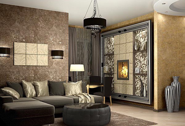 - Le mur de la cheminée, tapissé de papier peint 3D contrastant, la décoration en mosaïque de la cheminée, comme enfermé dans un cadre, et un mobilier élégant rendent la pièce moderne, élégante et inhabituellement confortable.