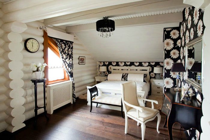 Le contraste des murs en rondins avec une couleur claire peut également être réalisé avec des papiers peints contrastants avec un grand motif, comme dans notre exemple.