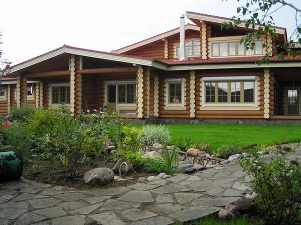 Ici, les coins sont coupés avec le reste, où la longueur des extrémités des bûches varie, ainsi que la configuration de leurs extrémités. - De cette façon, non seulement les coins de la maison en rondins ont été réalisés, mais aussi la véranda avec des zones près des fenêtres inhabituellement belles.Et la surface des murs est simplement peinte avec de la peinture légère pour attirer l'attention non pas sur la texture de l'arbre, mais sur la belle configuration des éléments de la maison en rondins.