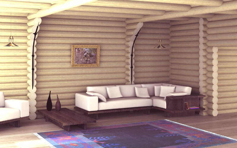 - Supposons que vous ayez coupé les joints de rondins sur les murs avec une corde ou de la peinture, comme dans notre exemple. Et ensuite? Sur quel élément intérieur se concentrer?