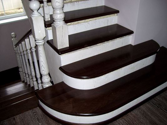 Pointe. Étant donné que le revêtement des escaliers en bois est réalisé avec un matériau non peint, après la pose, il convient de couvrir sa surface avec du vernis. Vous pouvez utiliser des agents de gradation spéciaux qui changeront la teinte du bois.
