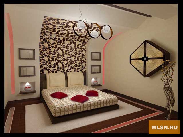 L'exemple ci-dessus montre une technique très populaire pour la décoration murale, dans le prolongement du plafond. Cela ressemble à ceci: le long de la tête du lit, qui fait face au mur, collez une bande de papier peint avec un motif épais.