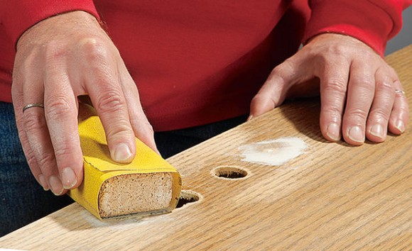 - Une fois le bois traité avec une teinture à base d'eau, les fibres du bois sont redressées et, pour niveler la surface, elles doivent être nivelées avec une toile émeri. Ensuite, la surface est essuyée avec un chiffon sec et recouverte d'une tache à nouveau.