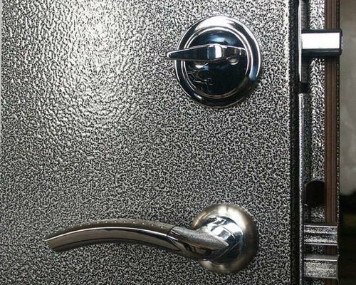 - Peinture marteau pour portes en fer le plus souvent utilisé si la porte est blindée. Elle donnera un ton qui sera similaire au fer d'un marteau et une surface rugueuse pour créer un style unique. L'émail a une excellente résistance aux dommages mécaniques, mais est sujet à l'humidité. Appliquez-le avec un pistolet pulvérisateur. N'oubliez pas qu'il ne peut pas être réparé. Cela signifie qu'il ne sera pas possible de peindre des défauts. Ici, il est nécessaire de retirer complètement l'ancienne couche et de repeindre à nouveau. En raison de sa haute résistance aux alcalis, aux acides et à d'autres environnements agressifs, la peinture époxy peut être utilisée lors de la peinture de portes dans des locaux industriels ou techniques. Elle est capable de colorer tous les métaux.