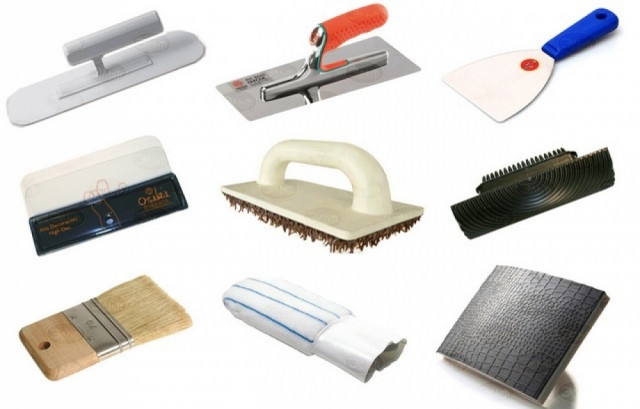 - Lorsque vous utilisez du mortier de ciment, préparez en plus la râpe et la râpe. Et pour travailler avec du gypse - une râpe avec une base en éponge, une spatule de 45 cm de large et une polisseuse de lissage pour le polissage de grandes et petites tailles.