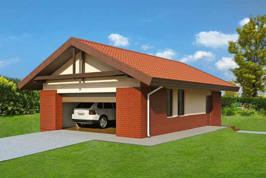 Soit dit en passant, le garage plâtré a également l'air très bien. Dans le même temps, pour la construction de murs, vous pouvez utiliser des briques de construction ordinaires, beaucoup moins chères que les faciales, puis les enduire magnifiquement.