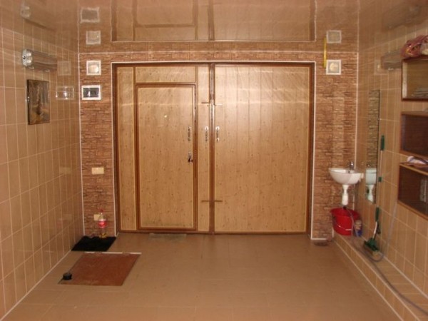 Bien sûr, le garage est fini avec des carreaux de revêtement en céramique ou en bois - c'est un luxe, il se révèle parfaitement, magnifiquement, confortablement. Mais avec un budget, c'est assez cher et tout le monde ne peut pas se le permettre. L'option budgétaire à mon avis est la finition en panneaux de particules. Cela ressemble à une sorte de bois, mais à un prix, il est très acceptable, et la vue du garage est complètement différente, beaucoup plus intéressante que le stuc peint nu. Même si les murs sont battus avec des revêtements ou des panneaux en plastique bon marché, le garage prend un aspect complètement différent, plus précis et bien entretenu. Bien que j'aie vu un garage, avec des murs simplement plâtrés peints par un artiste local - très spectaculaire !!!