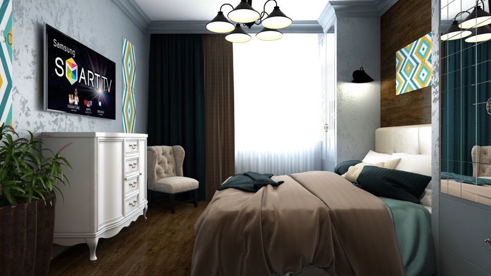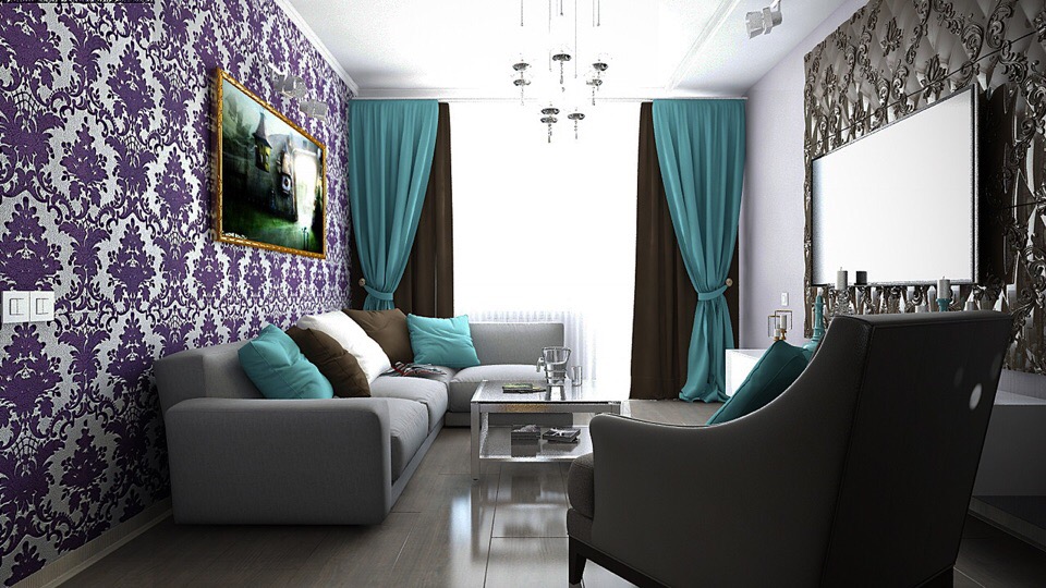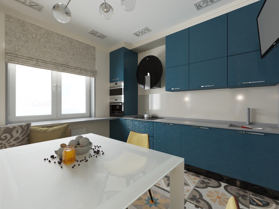 Maintenant, la tendance est aux nuances profondes de bleu, bleuet, émeraude et turquoise. Ce sont des couleurs froides, il est donc important de les mélanger avec compétence avec d'autres nuances de base. L'intérieur dans ce cas semble élégant et cher.