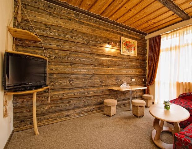 - Les murs décorés avec du bois dans cette version peuvent être peints ou teintés plusieurs fois - et cela, bien sûr, est un plus - pour repeindre les murs, et, en conséquence, l'intérieur peut être changé à plusieurs reprises.