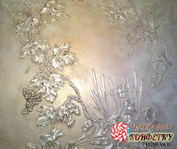 - Gypse. Il présente une longue conservation de son aspect élégant d'origine. C'est un matériau respectueux de l'environnement, adapté à une utilisation dans des pièces avec une humidité et une température différentes. Sur celui-ci, vous pouvez faire des dessins fantastiques, qui lisent parfaitement toutes les nuances du relief.