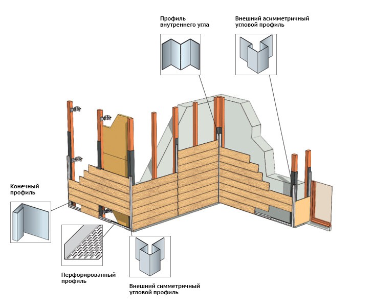 Vous pouvez niveler la surface avec des cloisons sèches, qui sont montées sur un cadre de profilé métallique ou avec du plâtre, qui a un certain nombre d'œuvres pour son application.