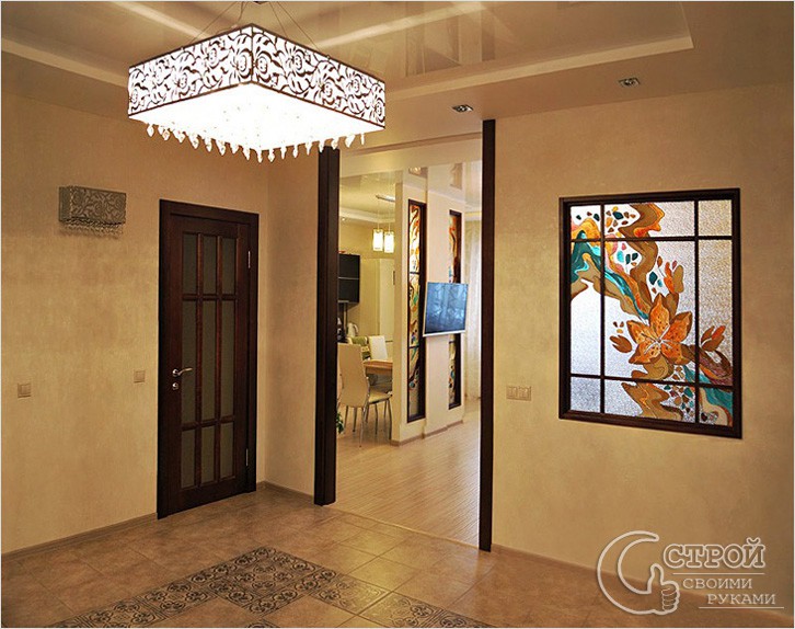- Une option idéale pour un couloir et un long couloir étroit est une fenêtre miroir. Le panneau du cadre inférieur peut être adapté sous un cintre pour parapluies, chapeaux ou clés en utilisant un miroir pour son usage prévu. Une telle solution originale donnera au couloir un look original.
