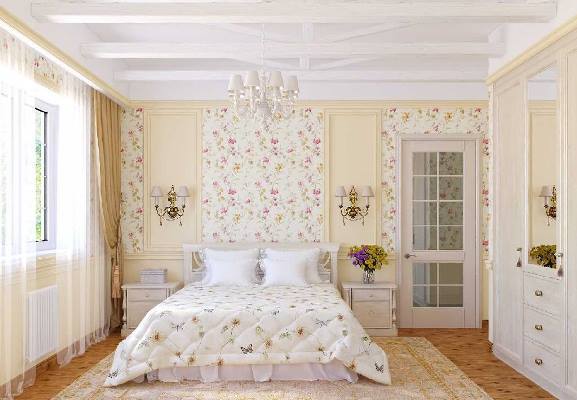- Style provençal il se révèle une pièce calme et modeste. Dans ce style, les papiers peints aux couleurs vives sont les mieux adaptés. Un design floral est également une excellente solution.