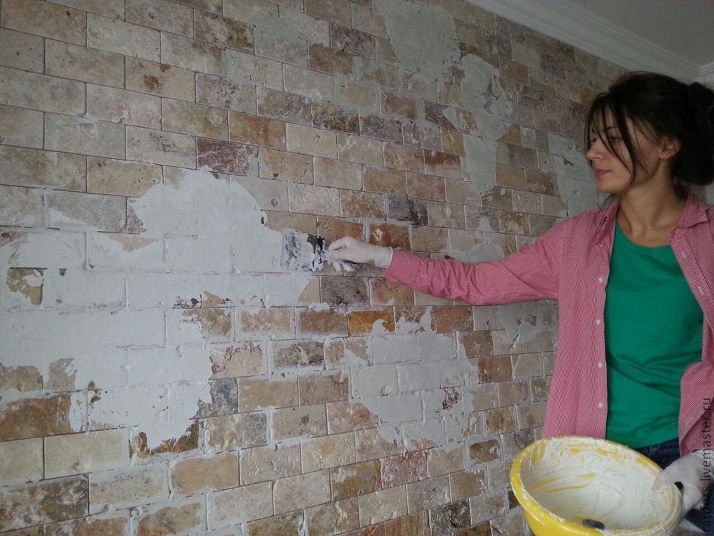 Un processus plus complexe, lors de la création de l'effet d'un vieux mur de briques, est l'utilisation de plâtre ordinaire ou décoratif de couleurs telles que:
