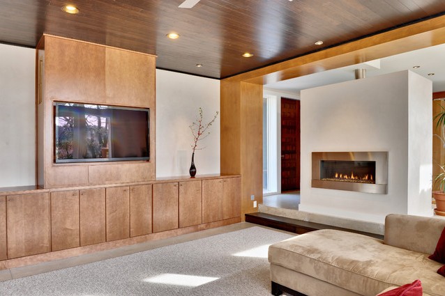 - Séparation. Dans le même temps, le téléviseur et la cheminée sont situés dans la même pièce, mais sur des murs différents. Panneaux en boissitué au plafond et au mur, comme encadré par une cheminée, ce qui donne l'impression de placer le téléviseur et la cheminée sur un mur.