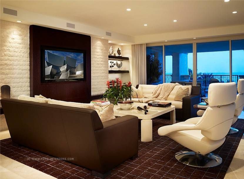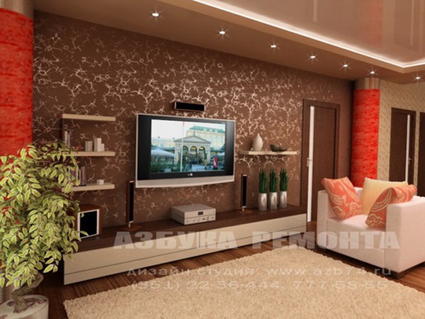 - Les caractéristiques de l'aménagement de la pièce sont prises en compte. Très souvent dans les projets, le téléviseur est un élément central, par rapport auquel les éléments intérieurs restants sont placés.