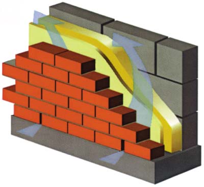 Pour que l'humidité ne s'accumule pas sur l'isolation et la surface intérieure du revêtement, l'instruction nécessite un espace de ventilation entre eux de quelques centimètres de large. Ainsi que le dispositif des soi-disant évents dans les rangées inférieure et supérieure (sous la corniche) de maçonnerie.