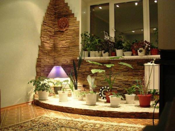 - Divers panneaux sont créés à partir de pierre décorative et les éléments structurels individuels sont doublés. Il peut s'agir d'arches et de passerelles intérieures, de balcons et de loggias ou, comme dans notre cas, d'un rebord de fenêtre dans lequel les plantes d'intérieur sont concentrées.