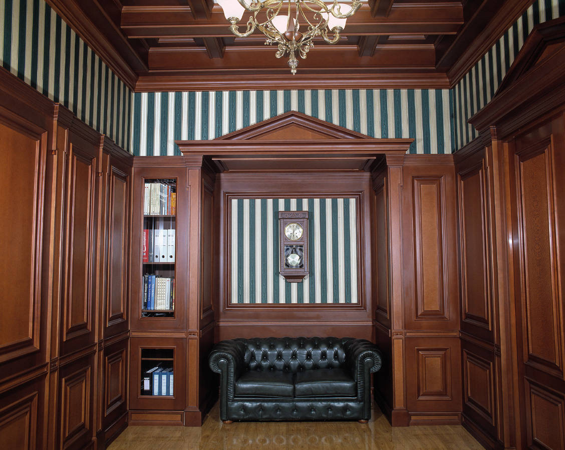 Le papier peint est collé dans leur partie supérieure ou le contreplaqué équipé de tissu est monté. Ce revêtement mural est parfaitement combiné avec un faux plafond à caissons ou vitraux.