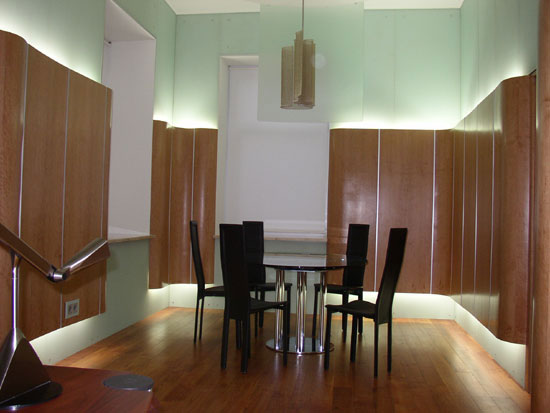 Dans l'exemple suivant, nous voyons un bel intérieur moderne, dans la conception duquel l'arbre n'a pas été utilisé du tout. Même les meubles de ce bureau ne sont pas en bois. - Néanmoins, la situation est très harmonieuse et fonctionne très bien. Les murs de cette pièce sont gainés de cloisons sèches, une niche est faite de contre-jour.