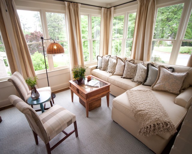 Sur l'image ci-dessus: le sol sous la plinthe est recouvert de moquette, sur tout le périmètre de la pièce. Ne faites pas sur la véranda sans meubles rembourrés - eh bien, quelles vacances sans un canapé confortable!