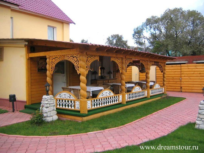 Le plafond est ourlé avec un bardeau standard, et le parapet est fait de barres ordinaires utilisées pour l'installation de lattes. - Mais de nombreux propriétaires ne veulent pas économiser sur la décoration de la véranda, et préfèrent concevoir ce coin de détente, solidement et solidement, comme on dit, depuis des siècles. Pour de tels cas, les fabricants de matériaux décoratifs à base de bois trouveront toujours les bonnes offres.