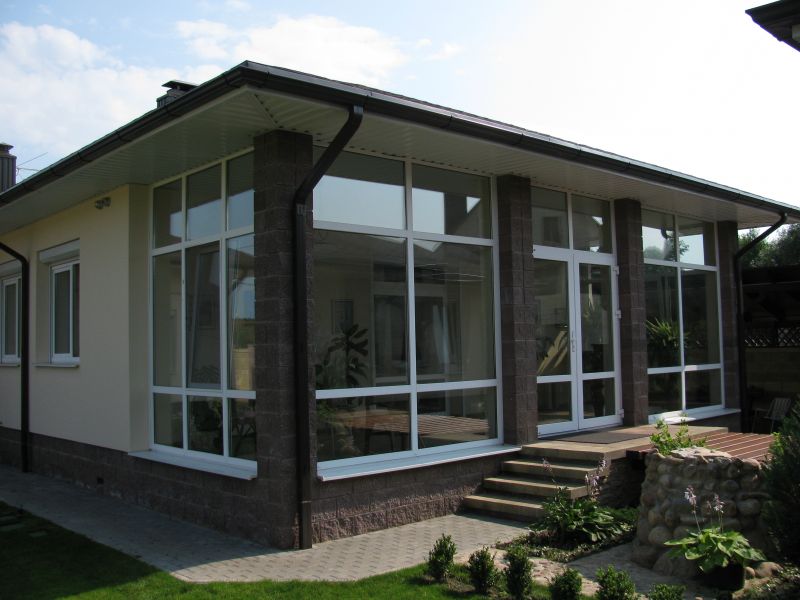 Par ailleurs, dans ce cas, ouvertures de fenêtres pourrait être réalisée sur le toit, à la manière de lucarnes. Dans la construction des murs de la véranda, vous pouvez combiner les deux options mentionnées ci-dessus: un mur est fait de blocs de verre et les deux autres sont faits de vitraux en aluminium.