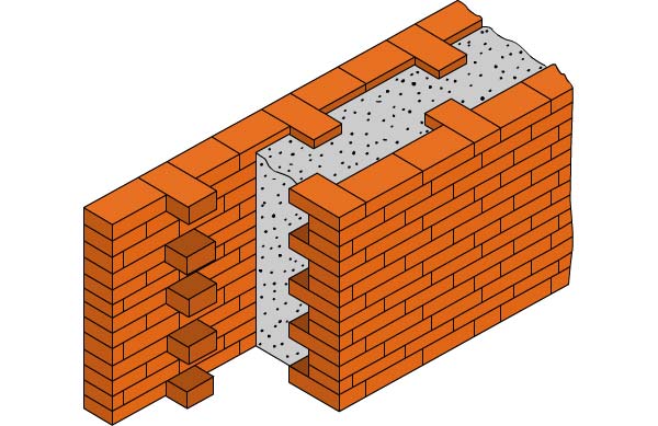 Si les puits sont remplis de béton ou de mousse, ils organisent généralement tous les cinq rangs la libération des rangées de points, qui devraient jouer le rôle d'ancres.Lors de l'utilisation de matériaux en vrac, les murs sont reliés par des bandes de maille d'acier à mailles fines, qui non seulement assurent une fixation rigide des murs, mais ne permettent pas non plus à l'isolation de se déposer et de s'égarer en dessous, laissant des vides sur le dessus.