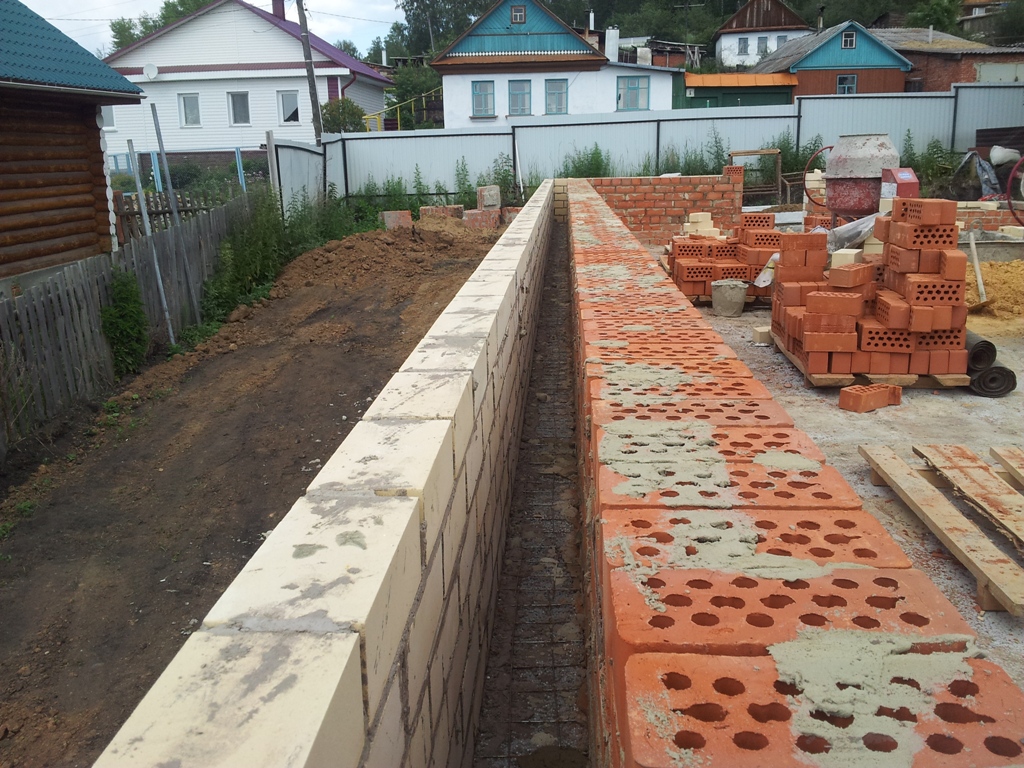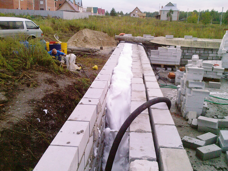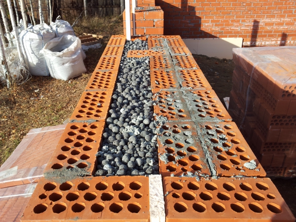 Lorsque des ouvertures sont prévues dans le mur, un conteneur avec une solution est situé en face d'eux, et il est plus pratique de mettre une palette avec une brique sur la ligne du mur. Si une maçonnerie légère des murs est réalisée, les matériaux de base alternent avec des renforts et des agrégats en vrac ou d'autres matériaux calorifuges.