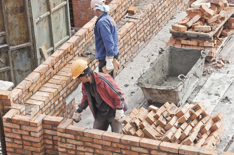 - Des ouvriers peu qualifiés posent des briques, étendent un lit de mortier, posent des rangées de secours, comblent des vides dans la maçonnerie.