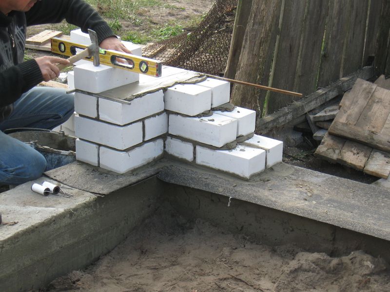 La pose est effectuée sur une surface bien alignée de la fondation et commence par les coins. Sur eux, ainsi que dans les zones où se trouvent les ouvertures, les porteurs de phare effilés vers le haut (emballés) jusqu'à 6 ou 8 rangées de haut sont préalablement exécutés.