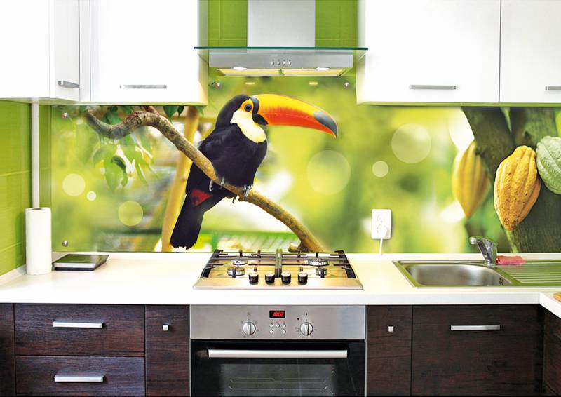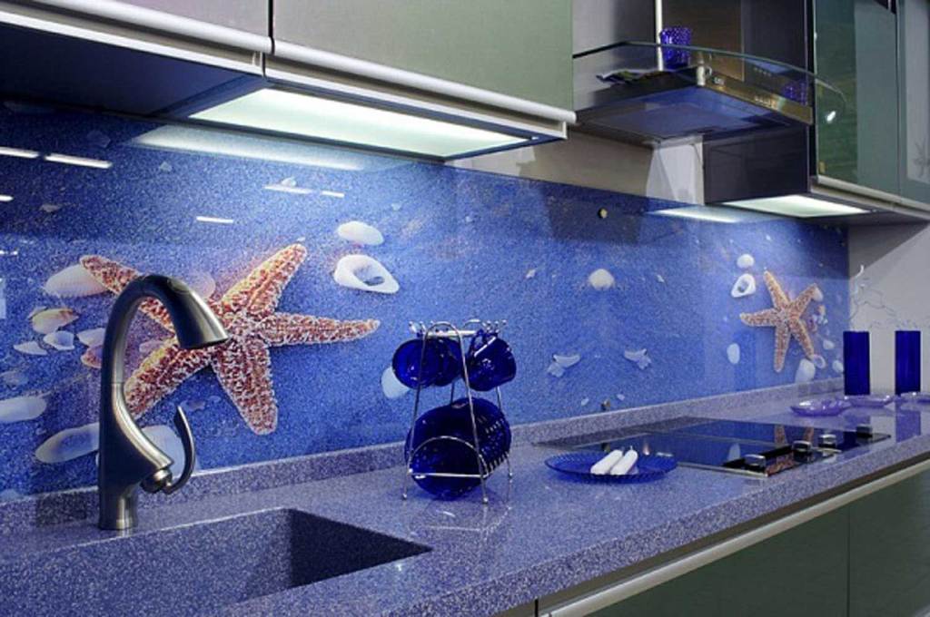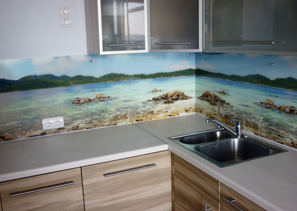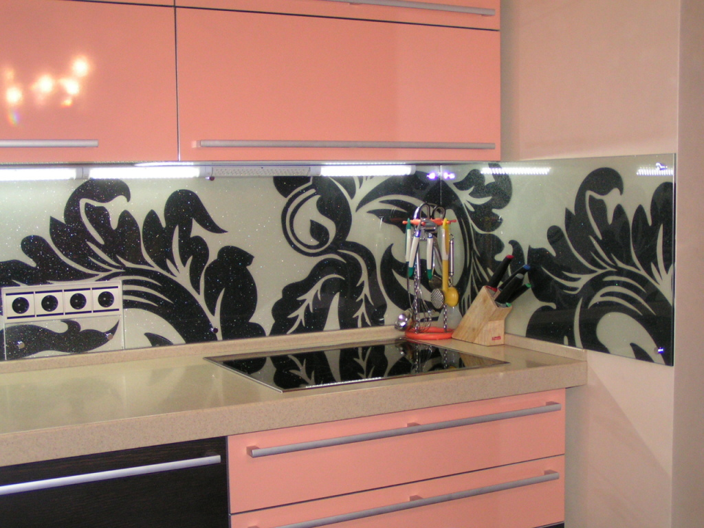 - Nous voyons un exemple d'un tablier de cuisine en verre, qui met l'accent sur le style de la cuisine avec son motif