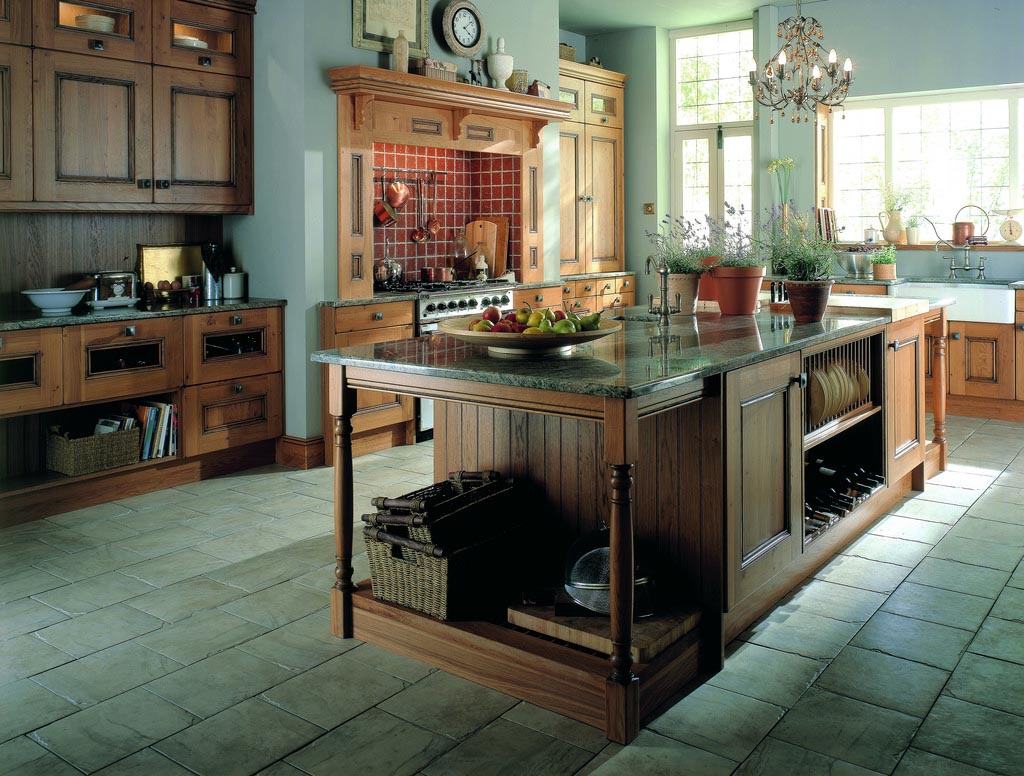 Malheureusement, tout le monde n'a pas la possibilité de construire une cheminée à la maison, et dans un appartement, c'est complètement impossible. Bien sûr, vous pouvez le remplacer par une imitation ou utiliser des foyers électriques, si l'occasion se présente. Les murs d'une cuisine de style campagnard avec une cheminée ou un poêle sont immédiatement plus une centaine de points pour véhiculer l'atmosphère d'un village américain.