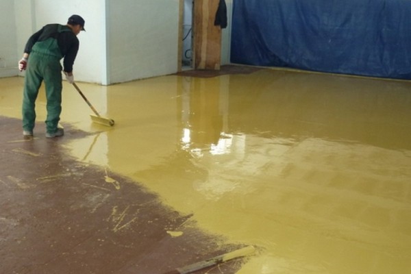 - Pour appliquer l'apprêt époxy, nous prenons une spatule en caoutchouc ou un rouleau à courte pilosité. Le secret principal d'un travail réussi, il faut se dépêcher, car le sol perd toutes ses caractéristiques utiles en une demi-heure, à partir de là, mettre l'apprêt le plus rapidement possible.