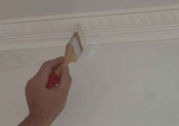 - La peinture à l'eau est très bien appliquée et la couche est uniforme et suffisamment épaisse pour remplir tous les pores des éléments décoratifs. N'oubliez pas la propreté. Avant de commencer la coloration, vous devez effacer la poussière et retirer les toiles d'araignée des carreaux, plinthes, prises et autres détails décoratifs.