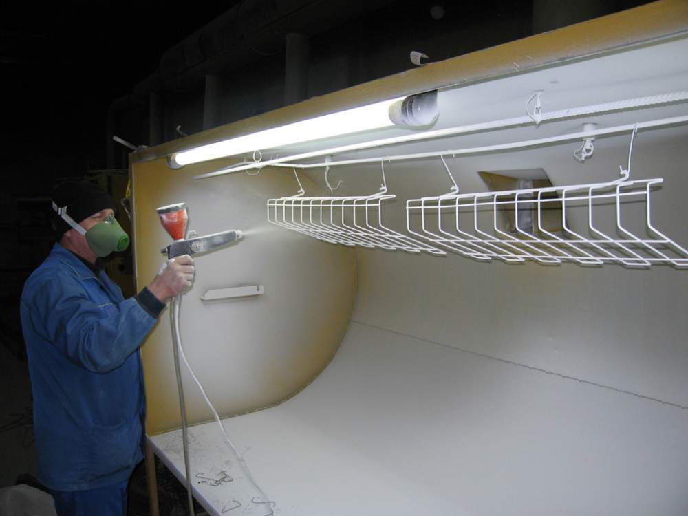 Le secret est que malgré la pression assez élevée du compresseur, la poudre est soufflée très lentement du pistolet et la peinture se déroule à une distance proche du métal, ce qui empêche la peinture de s'échapper dans différentes directions. Si nous parlons d'ateliers spécialisés, le revêtement en poudre des structures métalliques est effectué dans des chambres scellées, avec une ventilation spéciale et un système de filtre.