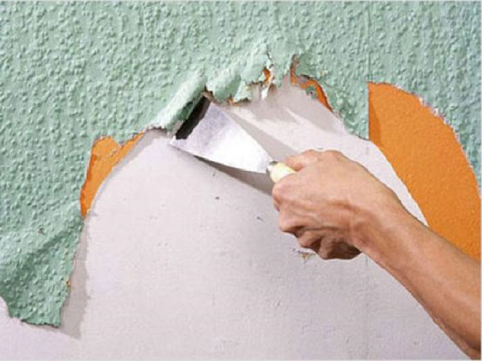 - Après un gonflement suffisant de la peinture, vous devez prendre une spatule et frotter pour enlever la couche humide. Pour éviter de casser accidentellement la base du plafond, gardez la spatule parallèle à la surface.