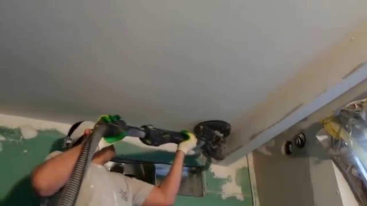 - Si le plafond a été peint avec de la peinture résistante à l'humidité, pour le retirer, il est préférable d'utiliser un broyeur ou une perceuse avec une buse spéciale. Au cours de ce travail, une grande quantité de poussière fine se forme, donc pour la protection, il est nécessaire d'utiliser un respirateur et des lunettes de sécurité spéciales.