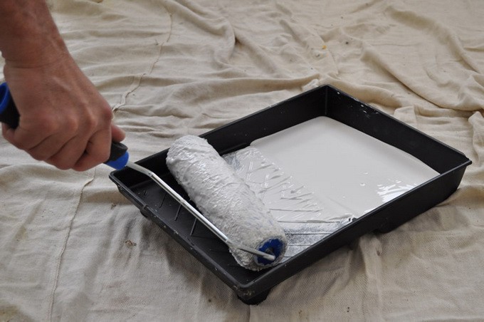 - Les plans lisses sont peints au rouleau. La peinture est versée dans un bac ou une cuvette, le rouleau est à moitié plongé dedans et roulé sur la partie ondulée du récipient.