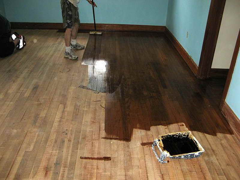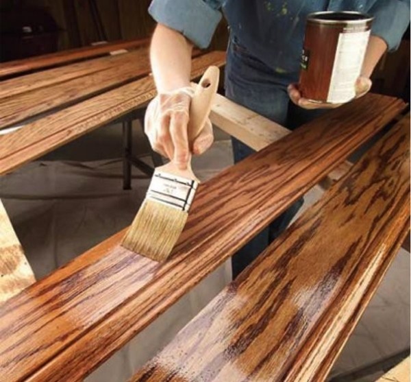 - Il est important de suivre une certaine technologie. Appliquez de la peinture le long des fibres de bois. Les travaux commencent par le périmètre et les plinthes;