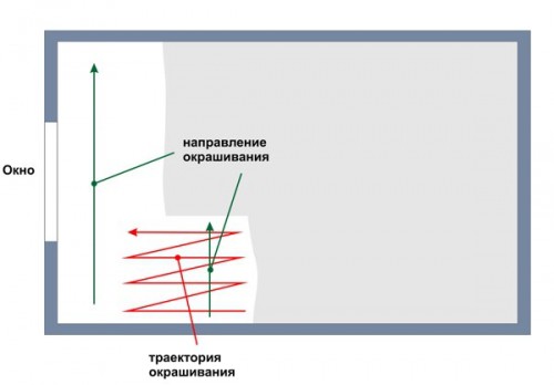 Astuce: La première couche de peinture est appliquée au plafond parallèlement aux fenêtres. Il doit être appliqué avec un "run" de chaque bande suivante de la composition sur la précédente d'environ 12 centimètres.