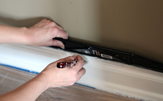 - Prenez une spatule large (propre), une feuille de plastique ou de carton (mince pour un meilleur ajustement) et remplacez-la sous la plinthe, en la pressant contre le mur lors de la peinture de la plinthe.